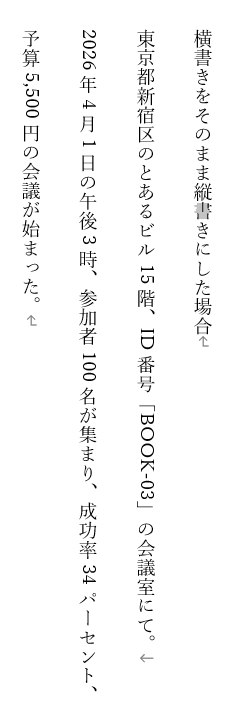 そこで直面するのが、「横書き原稿をそのまま縦書きにすると、数字が読みにくい、不自然に見える」という問題です。