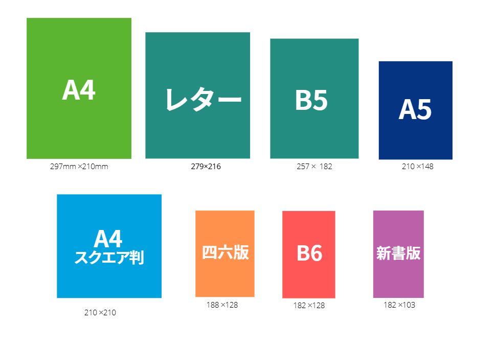 A4判/A4スクエア判/レター判/B5判/A5判/四六判(シロクバン)/B6判/新書判