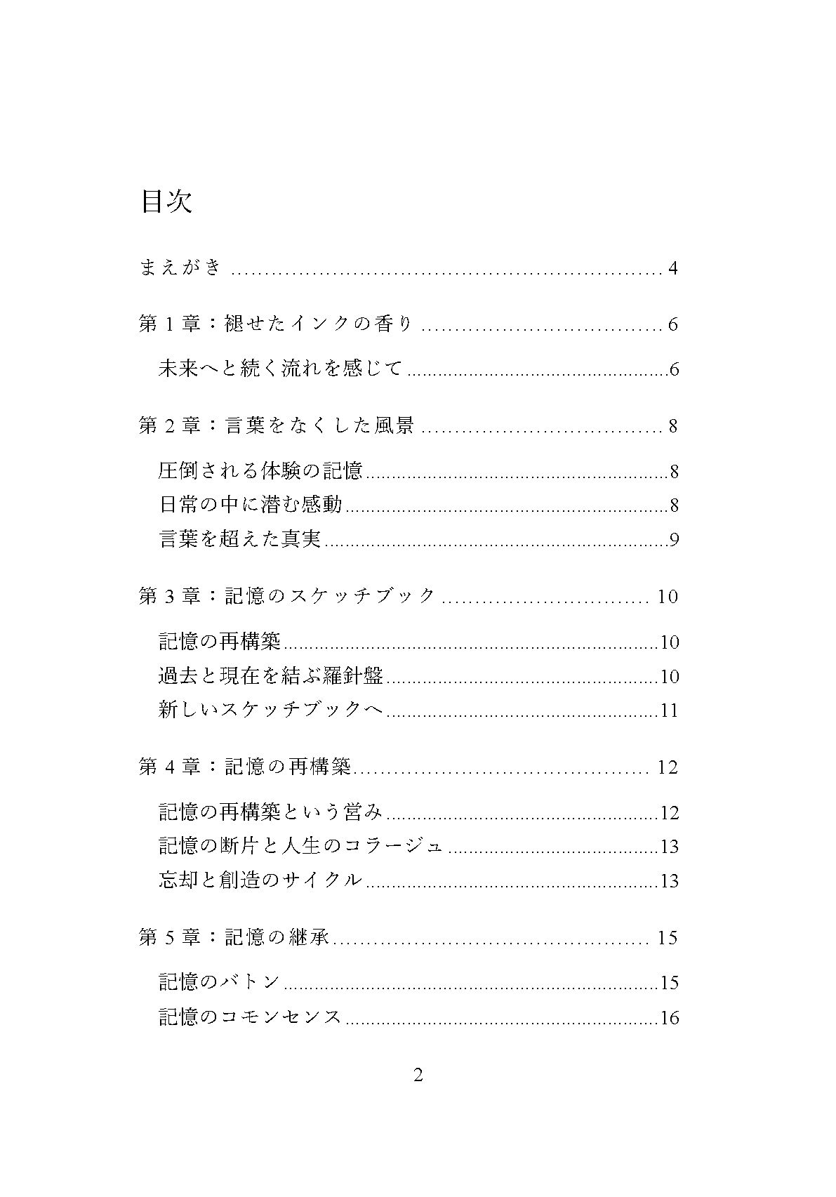 章のタイトルとページ番号が自動で目次に反映されます。Kindleの電子書籍にも対応しており、読者は目的のページにすぐに移動できます。