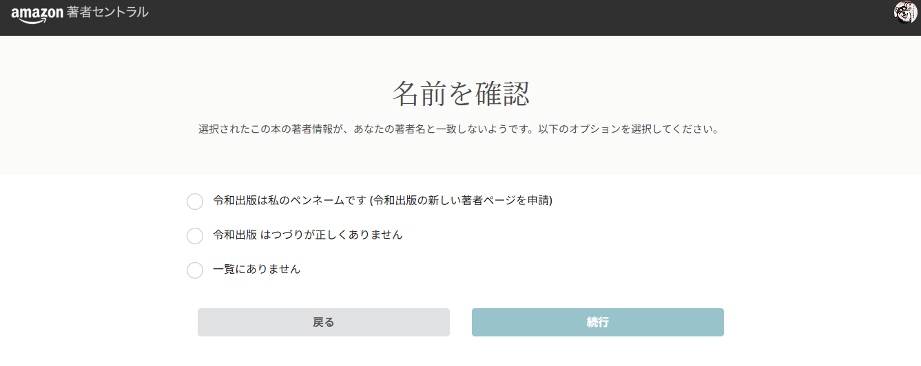 自分の書籍の表紙を選択したら、著者名の選択画面が表示されます。ご自身の名前を選択し、続行を押して下さい。